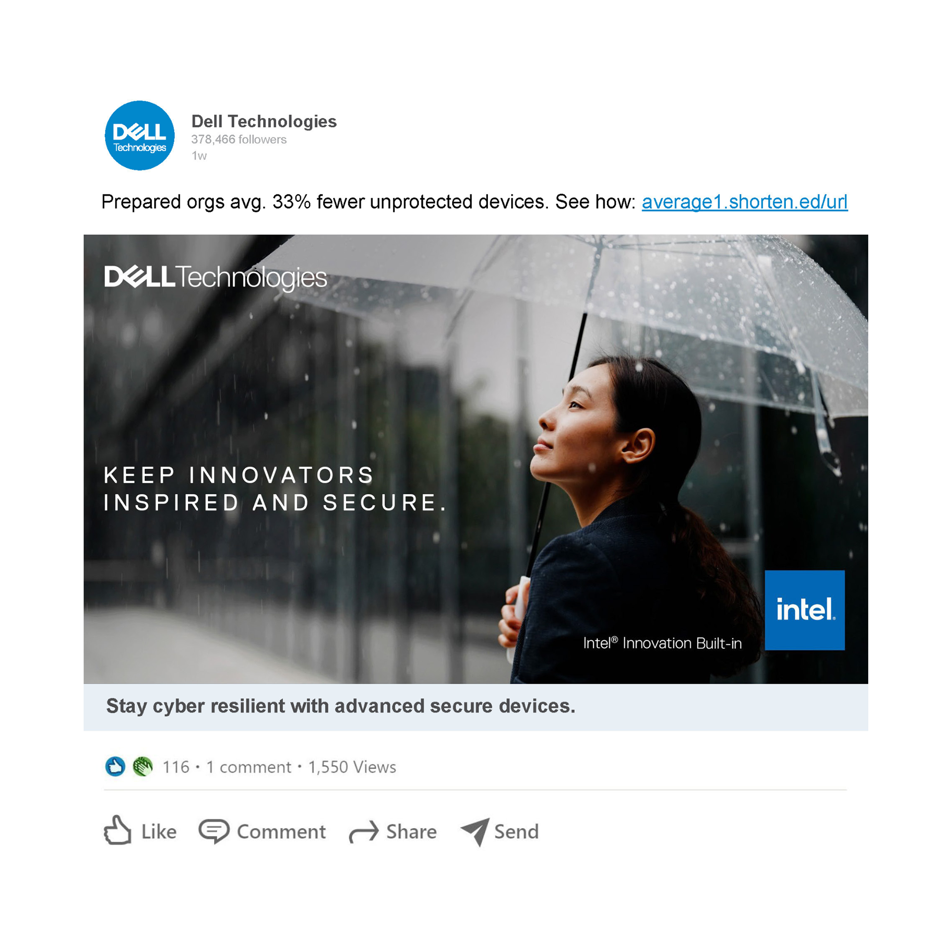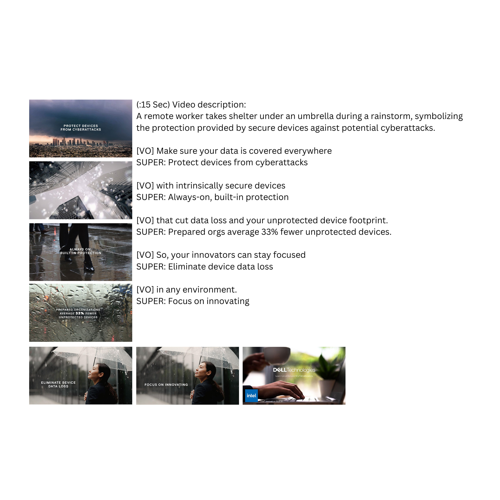 Remote work brings more cyber threats. Thankfully, Dell devices act like an umbrella, giving employees the freedom to innovate anywhere with built-in protection.
